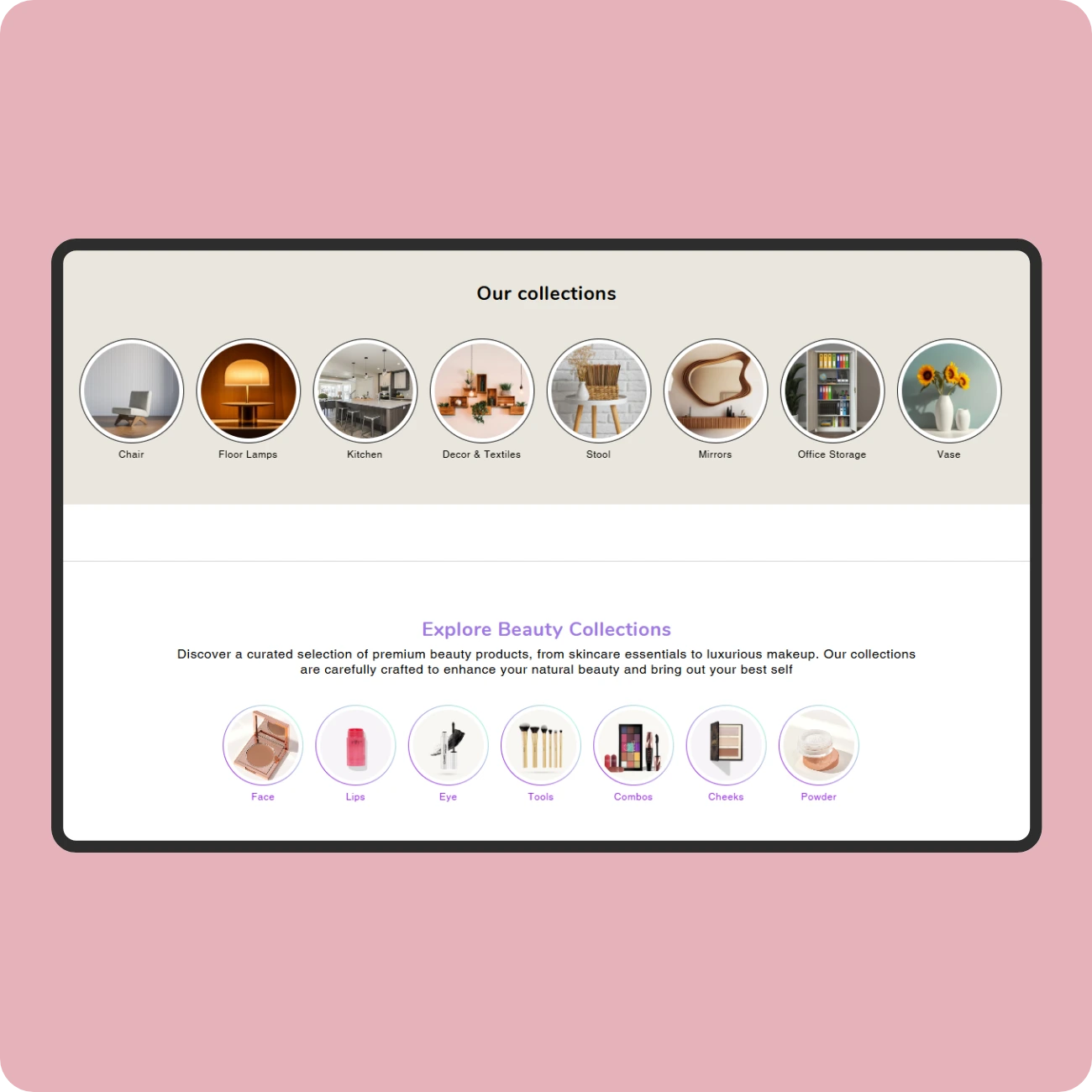 Guide shoppers through your offerings with the Collection List #5 section. With a modern, image-forward layout, this feature highlights multiple collections in an engaging and easily scannable format—perfect for introducing new arrivals or organizing your store by themes.