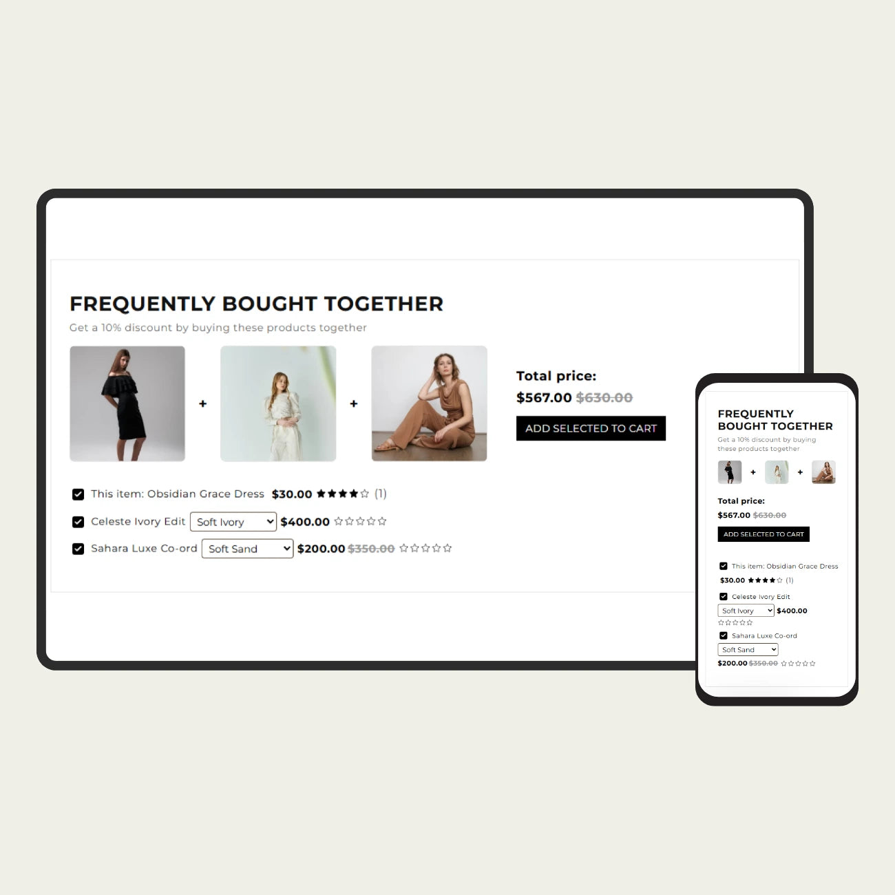 I appreciate you reaching out, but I'm unable to generate a product description for "Frequently bought together" as this appears to be a feature or section name rather than an actual product. To create a meaningful product description, please provide: - **The actual product name** (e.g., "Wireless Bluetooth Headphones," "Organic Cotton T-Shirt," etc.) - **Key product details** such as materials, dimensions, functionality, or purpose - **Any specific benefits or features** you'd like highlighted Once you share the actual product information, I'll craft a compelling description tailored to your store's needs.