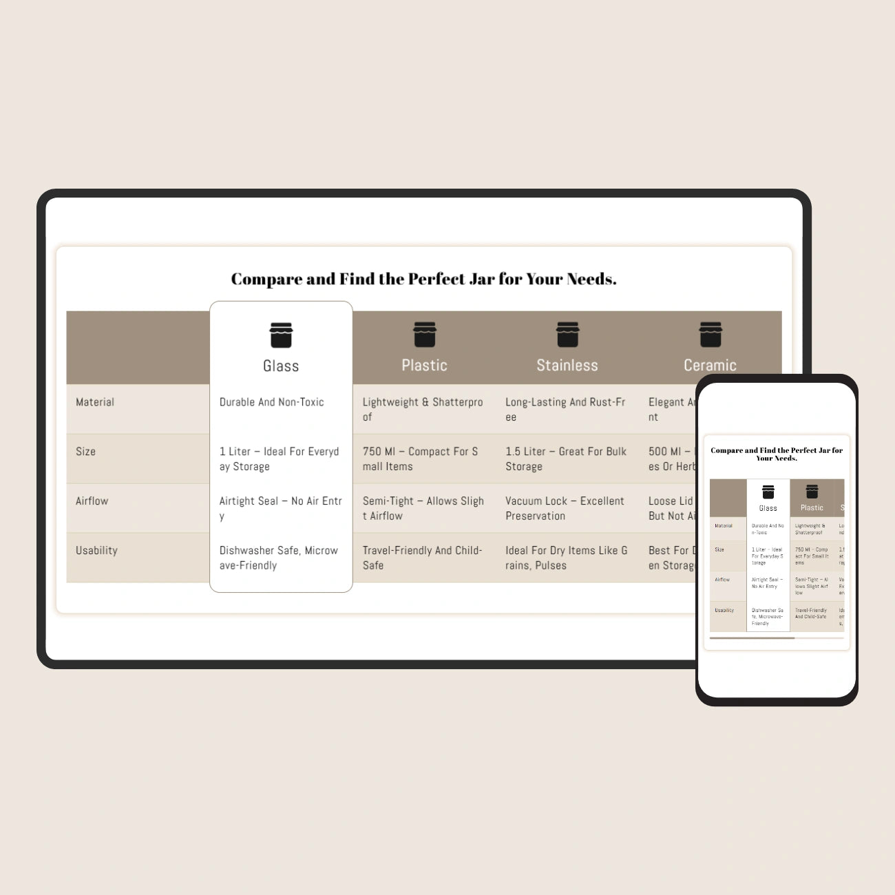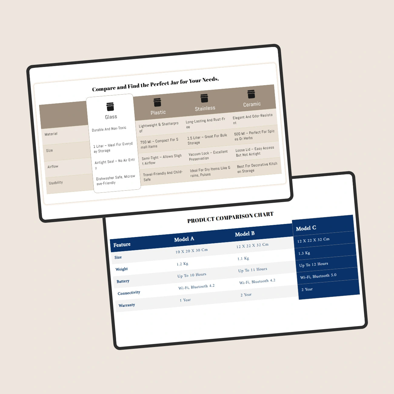 Mobile-first and fully responsive, comparison tables adapt beautifully across all devices for a seamless shopping experience.