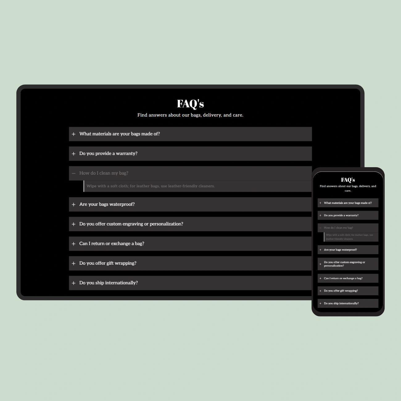 Enhance your Shopify store with the FAQ #1 Section, designed to provide clear and organized answers to common customer questions. This feature-rich section integrates seamlessly with any Shopify theme, offering a responsive, speed-optimized, and SEO-friendly solution. Improve customer satisfaction and reduce support inquiries by presenting your FAQs in a clean, easy-to-navigate format. Elevate your store’s professionalism and functionality with this essential addition.