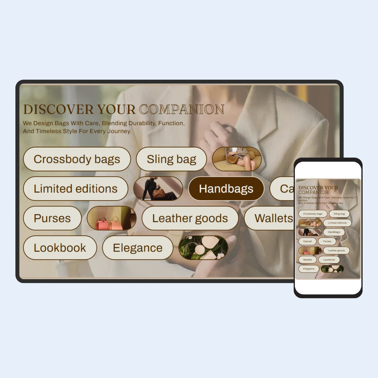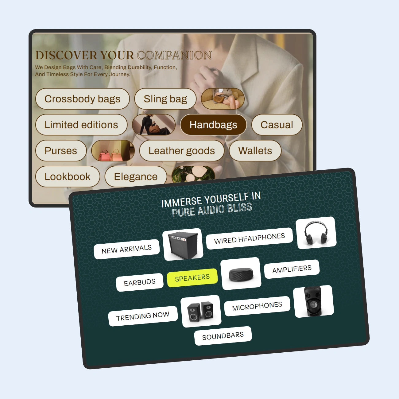 Smart, stylish navigation made simple. Quick pill-shaped buttons guide shoppers to collections, promos, or featured products — all optimized for mobile and easy to customize to your brand.